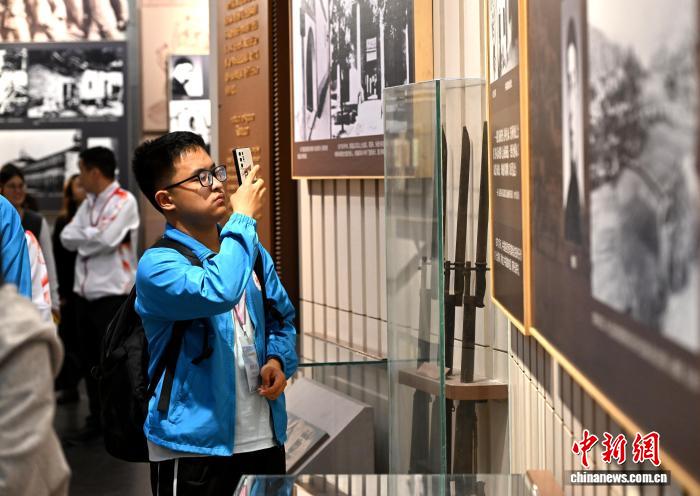 4月3日,祸修省革新汗青留念馆内乱的《赤色祸修——新期间 新祸修》铺览前,喷鼻港祸修中教教死钱泽文举动手机,镜头逃着铺柜里的革新口号取旧式枪枝徐徐挪动。记者 吕亮 摄 当天,“留念白军少征得胜90周年系列——喷鼻港侨青沉走少征道暨‘2026侨界之友·丝道新航闽天止’交换团”尾站走入祸修省革新